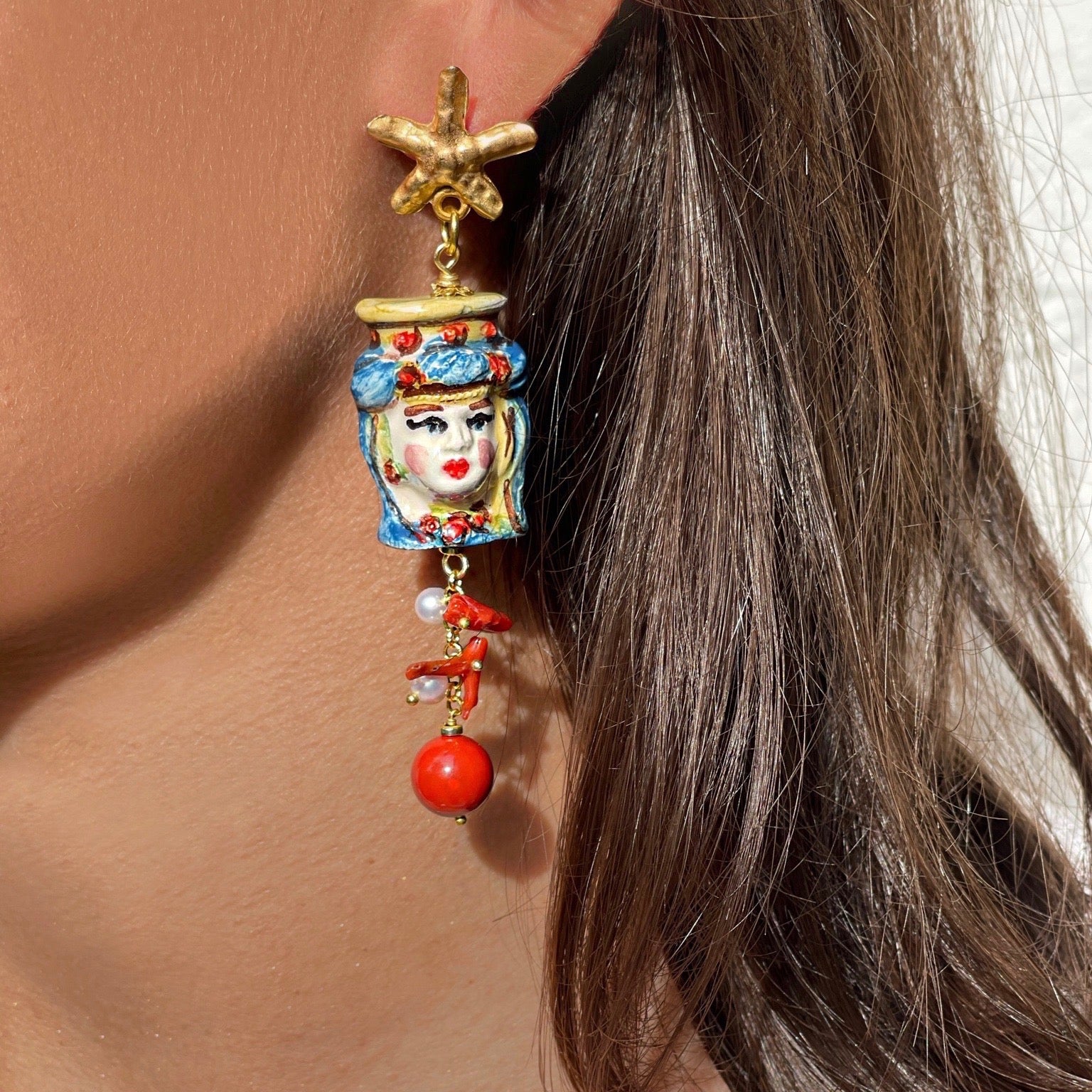 Willkommen auf Sizilien. Diese wunderschönen Statement-Ohrringe werden auf Sizilien handgefertigt und sind inspiriert von den Farben und Traditionen der italienischen Insel.