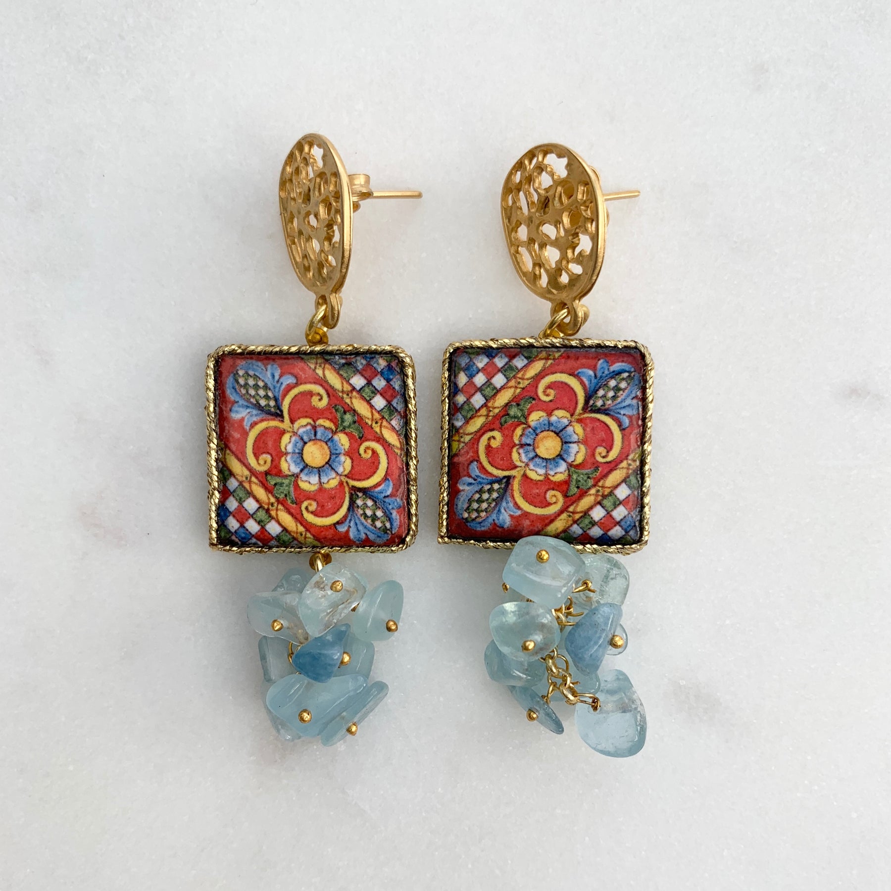 Willkommen auf Sizilien. Diese wunderschönen Statement-Ohrringe werden auf Sizilien handgefertigt und sind inspiriert von den Farben und Traditionen der italienischen Insel.